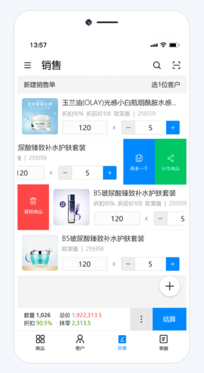 商品智能标签提取、客户智能解析标签提取,人货匹配,智能推荐开单。匹配手机、PDA等智能终端,通过扫描商品条码实现扫码一键快速开单,无需手动添加商品及加购商品,方便快捷。一键出库,开销售单的同时也可以操作单据出库,无需在开完销售单之后查找单据进行出库。