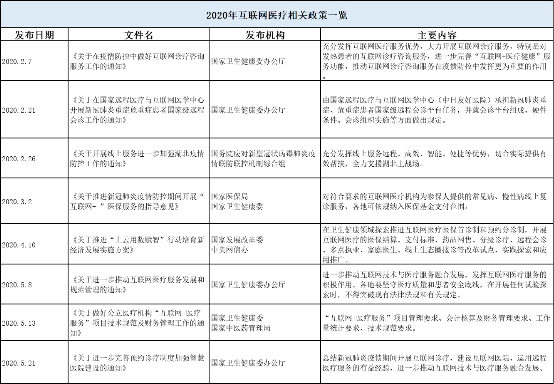 2020年疫情期间,以互联网为载体和技术手段,大量健康场景转移到线上,互联网医疗行业进入了发展快车道。相关券商分析师表示:“疫情加速了互联网医疗健康投资风口的到来,让大众、市场、政府更清晰的认识到互联网医药的社会价值,最大的意义是各项促进行业发展的政策迅速落地和短时间大规模市场教育带来的未来广阔市场空间。”为充分发挥互联网医疗在疫情中的作用,自2月起政府连续发布相应政策,对线上诊疗服务、医保结算、药品网售、远程会诊等多方面提出要求,进一步营造有助于互联网医疗服务健康发展的政策环境,并快速推动互联网技术与医疗服务的有效融合发展。